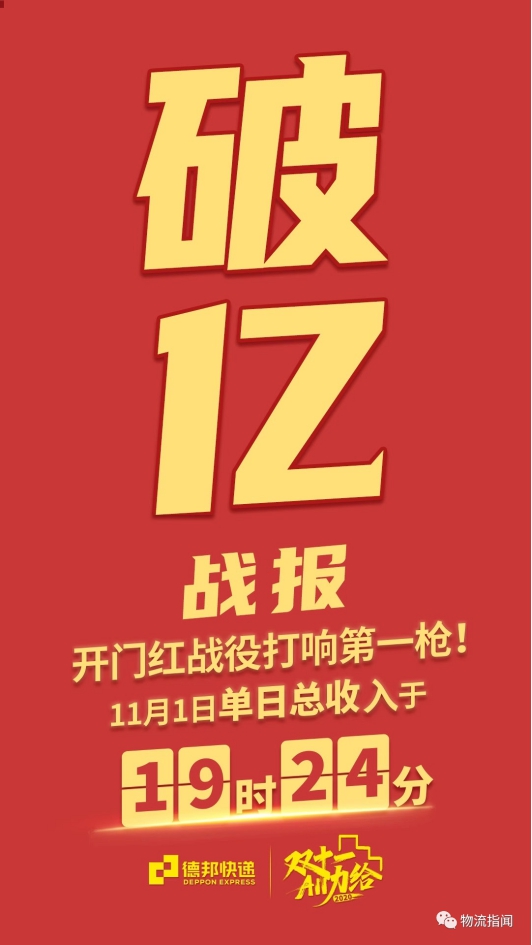 11月1日零点10分,由德邦快递承运的双十一大件快递第一单便乐成送达,仅用时10分钟,刷新了双十一大件快递首单纪录!19时24分,德邦快递单日总收入破亿。